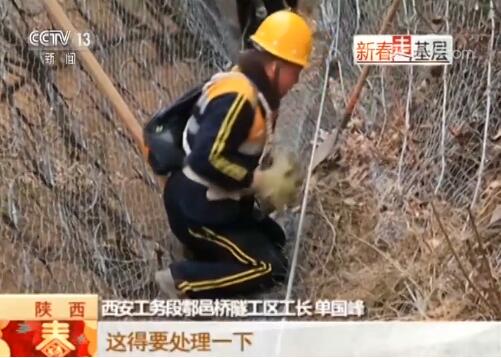西安工務(wù)段漢中橋隧車間鄠邑橋隧工區(qū)工長(zhǎng) 單國(guó)峰:這得要處理一下,滑落下來(lái)了,到了第一道網(wǎng),就要把它們?nèi)壳謇沓鋈ィ乐節(jié)L落到線路上去。找一個(gè)平一點(diǎn)的臺(tái)子,把它碼好、堆好,防止?jié)L落,有條件的情況下挖個(gè)坑給它掩埋了。