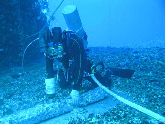 因為工程潛水需要在水下長時間作業(yè),打撈局的潛水員們不能像人們常見的潛水員那樣,利用背后的氣瓶供氣。他們靠一根甘蔗粗細(xì)的長管來維持水下的呼吸,在工程潛水領(lǐng)域,這根管子被稱作“臍帶”。