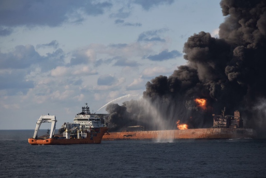 潛水隊員前往燃燒中的“桑吉”輪救援