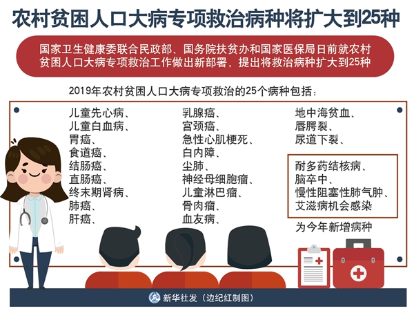 新華社北京5月14日電(記者屈婷)國家衛(wèi)生健康委聯(lián)合民政部、國務(wù)院扶貧辦和國家醫(yī)保局日前就農(nóng)村貧困人口大病專項救治工作做出新部署,提出將救治病種擴大到25種。