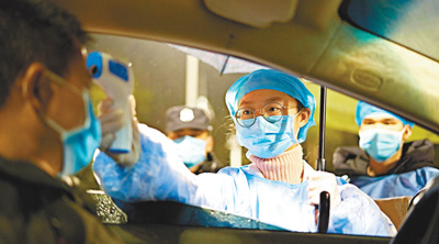 在廣西來(lái)賓市某高速公路出口,醫(yī)護(hù)人員為司機(jī)監(jiān)測(cè)體溫。高如金攝(人民視覺(jué))