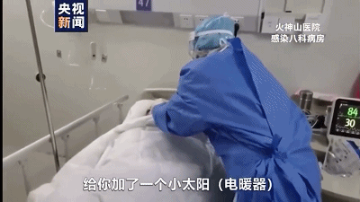 醫(yī)護(hù)人員站在病床邊俯下身說(shuō):