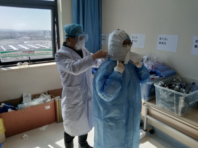 首先是防護裝備。進隔離病房一般是三級防護,除穿戴防護服、隔離衣、護目鏡、N95口罩、兩層手套,兩層腳套外,還要戴正壓防護頭套或一次性全面型防護頭套。此外,頭套還帶有新風(fēng)過濾系統(tǒng)。整套防護裝備,凌肯在老師的幫助下,花了半個小時才穿上。穿戴完畢,凌肯整個人都很難受。護目鏡起霧,頭套風(fēng)機發(fā)出巨大噪音,還有悶熱,整個人都變得遲鈍。