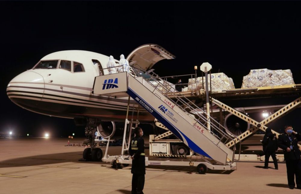 工作人員在武漢天河機(jī)場搬運(yùn)醫(yī)療物資(新華社記者 程敏 攝)