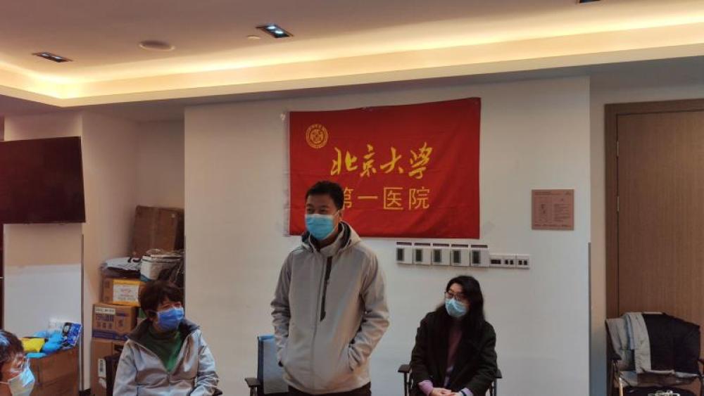 圖為北京大學(xué)第一醫(yī)院援湖北醫(yī)療隊李海潮和2019級臨床專業(yè)的學(xué)生開網(wǎng)絡(luò)會議。