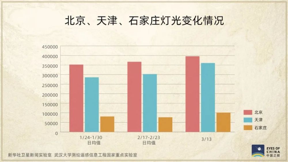 這是春節(jié)期間至3月13日,京津冀地區(qū)夜間燈光亮度變化情況,2月下旬起亮度出現提升。