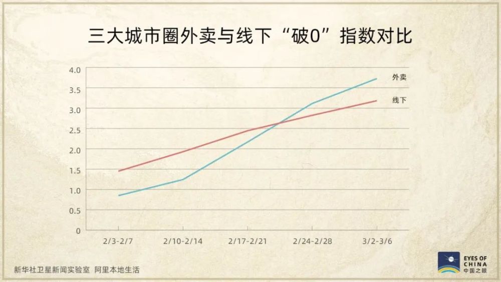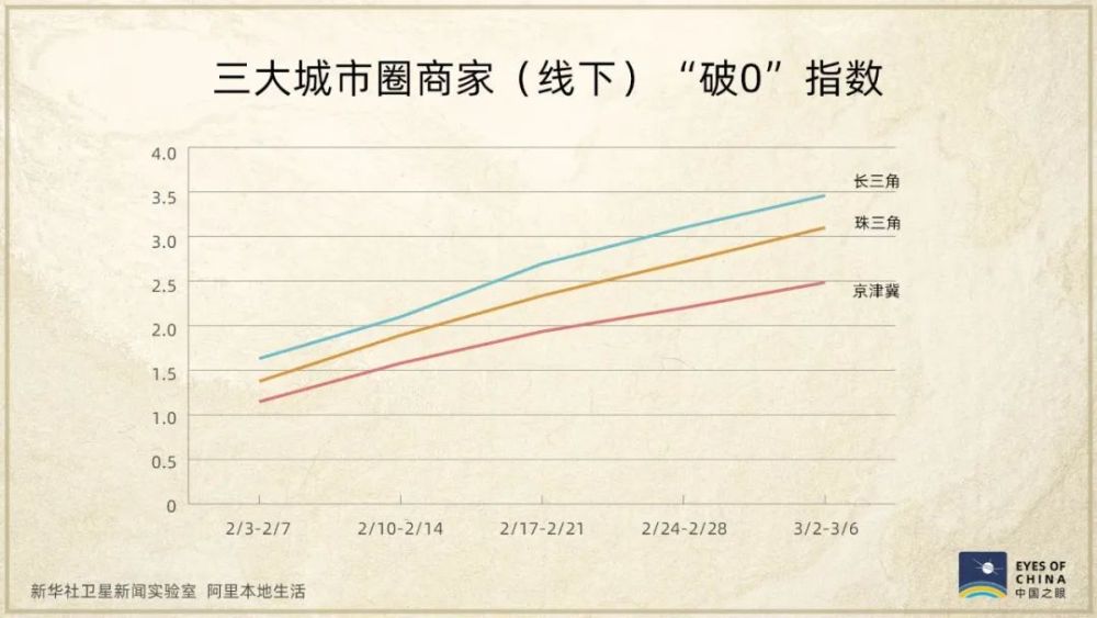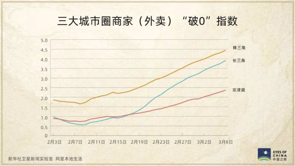 “破0”指數,是根據商家恢復營業(yè)獲得首筆收入、復工后的持續(xù)營業(yè)時間等計算得出,這兩張圖呈現出,在三大城市圈,復工復產并獲得收入的商家不斷增多。