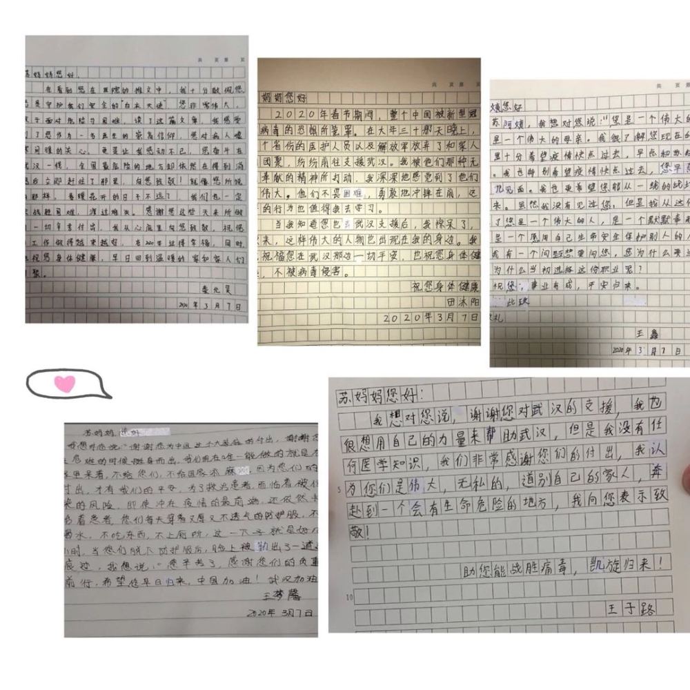 這些孩子們不曾來到武漢,但是他們的來信,對我來說都是一種鼓勵,是我前行的動力。其實在這場戰(zhàn)“疫”中,他們的父母也都和我一樣,在默默地為大家做著自己能做到的一切。他們或許是教師、是警察,或許是公司的普通職員,但他們也都在自己所從事的行業(yè)里、在自己的崗位上堅守著。