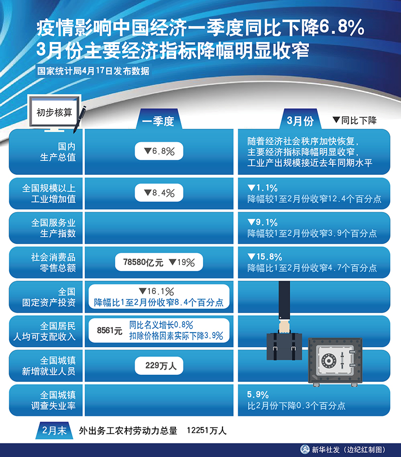 新華社北京4月17日電(記者陳煒偉、安蓓)國(guó)家統(tǒng)計(jì)局17日發(fā)布數(shù)據(jù),初步核算,一季度國(guó)內(nèi)生產(chǎn)總值同比下降6.8%。3月份,隨著經(jīng)濟(jì)社會(huì)秩序加快恢復(fù),主要經(jīng)濟(jì)指標(biāo)降幅明顯收窄,工業(yè)產(chǎn)出規(guī)模接近去年同期水平。