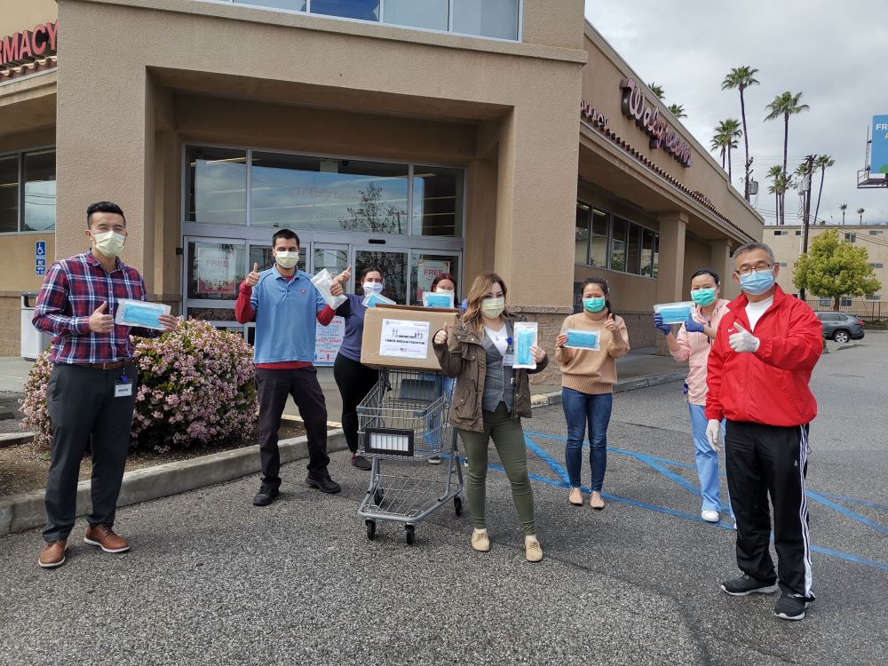 2020年4月7日,在美國(guó)洛杉磯縣天普市,美國(guó)南加州華人聯(lián)合總會(huì)代表向當(dāng)?shù)匾患宜幍昃栀?zèng)口罩時(shí)合影。(新華社發(fā))