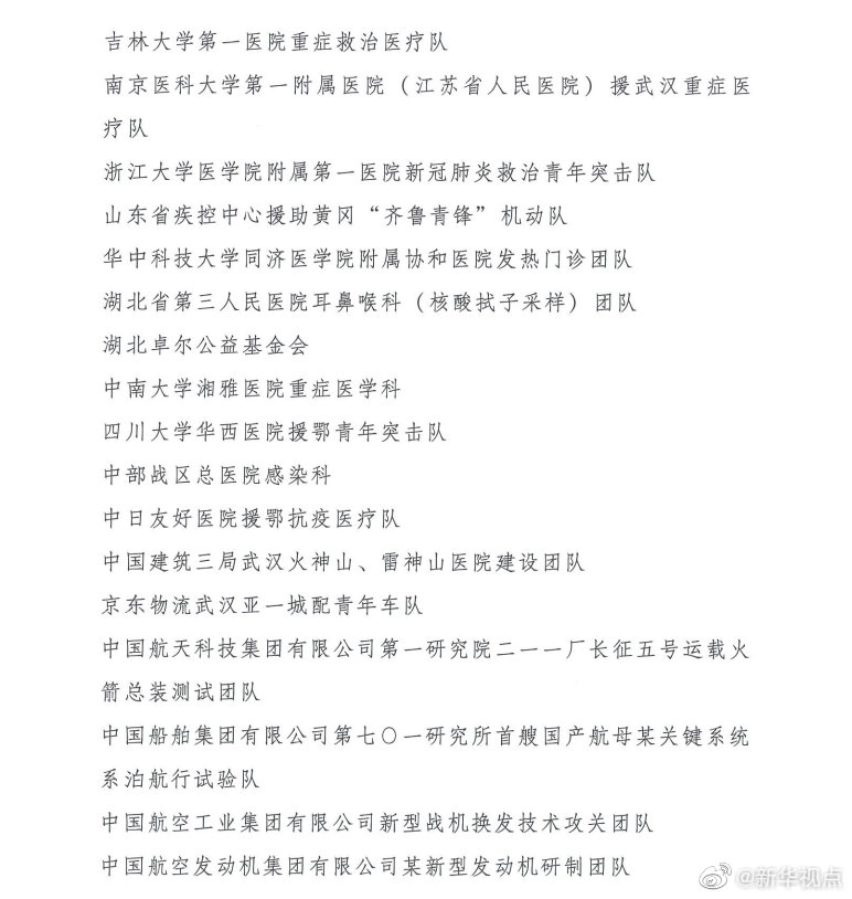 榮獲“中國青年五四獎章集體”的分別是:北汽福田國慶70周年群眾游行彩車底盤制作和技術保障團隊,天津飛騰嵌入式CPU研發(fā)團隊,河北醫(yī)科大學第一醫(yī)院“先心病”愛心團隊,太鋼集團不銹鋼“手撕鋼”創(chuàng)新研發(fā)團隊,哈爾濱工業(yè)大學紫丁香學生微納衛(wèi)星團隊,諸暨市公安局楓橋派出所,科大訊飛認知智能國家重點實驗室創(chuàng)新團隊,南昌大學“稻漁工程”團隊,濰柴青年科技創(chuàng)新團隊,中國散裂中子源建設團隊,中國航發(fā)渦輪院某發(fā)動機研制團隊,甘肅省無償捐獻遺體器官志愿服務隊,清華大學研究生支教團青海湟中分隊,73022部隊56分隊,新一代精打體系武器系統(tǒng)青年創(chuàng)新團隊,北京大學援鄂抗疫醫(yī)療隊,中國醫(yī)科大學新冠肺炎疫情防控醫(yī)療總隊,吉林大學第一醫(yī)院重癥救治醫(yī)療隊,南京醫(yī)科大學第一附屬醫(yī)院(江蘇省人民醫(yī)院)援武漢重癥醫(yī)療隊,浙江大學醫(yī)學院附屬第一醫(yī)院新冠肺炎救治青年突擊隊,山東省疾控中心援助黃岡“齊魯青鋒”機動隊,華中科技大學同濟醫(yī)學院附屬協(xié)和醫(yī)院發(fā)熱門診團隊,湖北省第三人民醫(yī)院耳鼻喉科(核酸拭子采樣)團隊,湖北卓爾公益基金會,中南大學湘雅醫(yī)院重癥醫(yī)學科,四川大學華西醫(yī)院援鄂青年突擊隊,中部戰(zhàn)區(qū)總醫(yī)院感染科,中日友好醫(yī)院援鄂抗疫醫(yī)療隊,中國建筑三局武漢火神山、雷神山醫(yī)院建設團隊,京東物流武漢亞一城配青年車隊,中國航天科技集團有限公司第一研究院二一一廠長征五號運載火箭總裝測試團隊,中國船舶集團有限公司第七〇一研究所首艘國產航母某關鍵系統(tǒng)系泊航行試驗隊,中國航空工業(yè)集團有限公司新型戰(zhàn)機換發(fā)技術攻關團隊,中國航空發(fā)動機集團有限公司某新型發(fā)動機研制團隊。