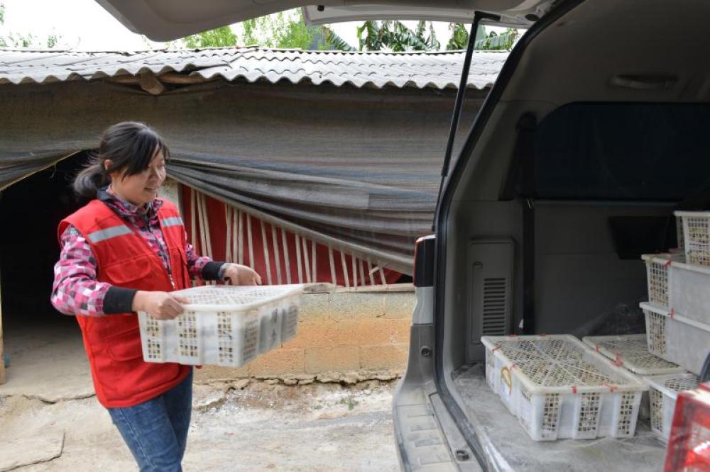 廣西百色市德保縣敬德鎮(zhèn)馱信村駐村第一書記李梅在裝運(yùn)即將出售的鵪鶉蛋(資料照片)。新華社發(fā)