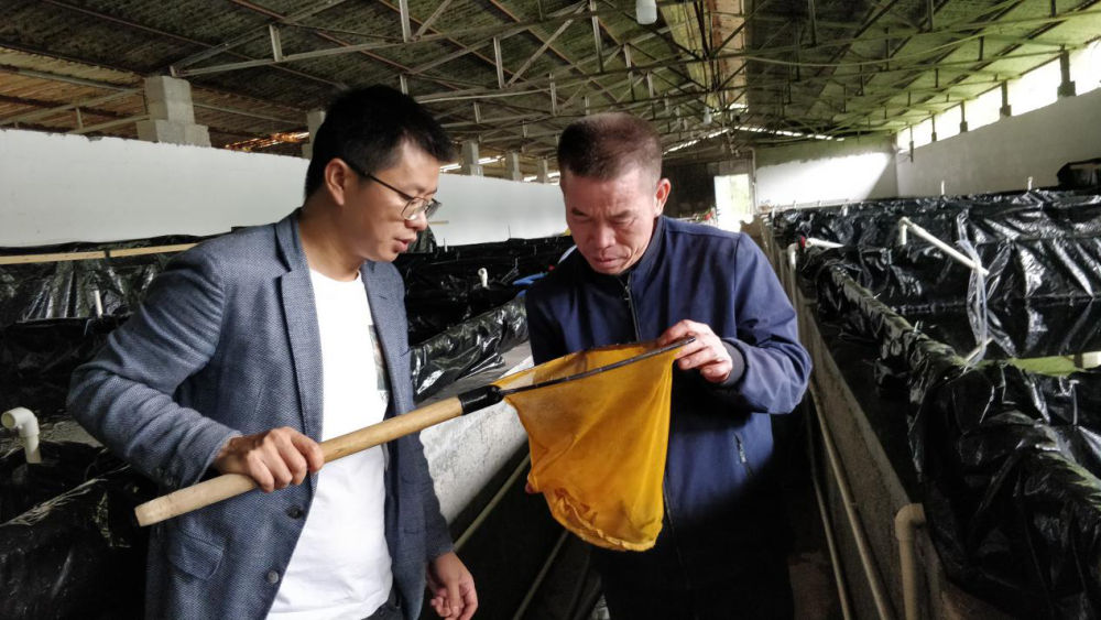 廣西上林縣西燕鎮(zhèn)岜獨(dú)村駐村第一書記康勇(左一)在龜鱉養(yǎng)殖場和養(yǎng)殖能人交流(4月24日攝)。新華社記者 農(nóng)冠斌 攝
