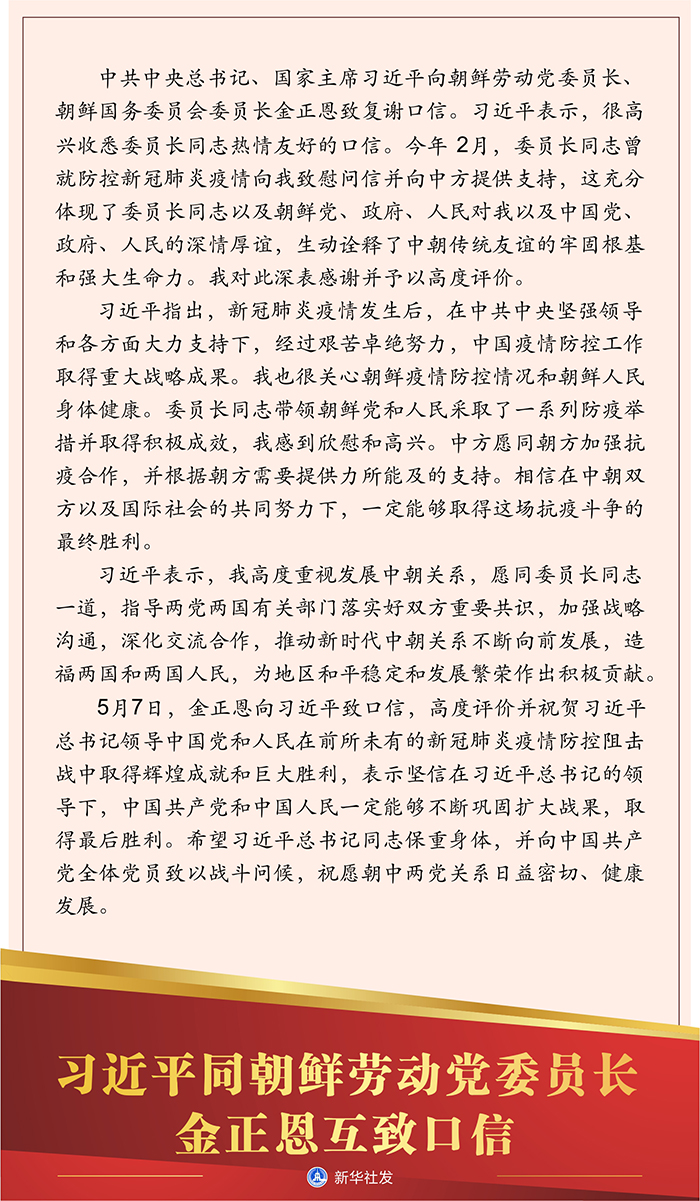 5月7日,金正恩向習(xí)近平致口信,高度評價(jià)并祝賀習(xí)近平總書記領(lǐng)導(dǎo)中國黨和人民在前所未有的新冠肺炎疫情防控阻擊戰(zhàn)中取得輝煌成就和巨大勝利,表示堅(jiān)信在習(xí)近平總書記的領(lǐng)導(dǎo)下,中國共產(chǎn)黨和中國人民一定能夠不斷鞏固擴(kuò)大戰(zhàn)果,取得最后勝利。希望習(xí)近平總書記同志保重身體,并向中國共產(chǎn)黨全體黨員致以戰(zhàn)斗問候,祝愿朝中兩黨關(guān)系日益密切、健康發(fā)展。