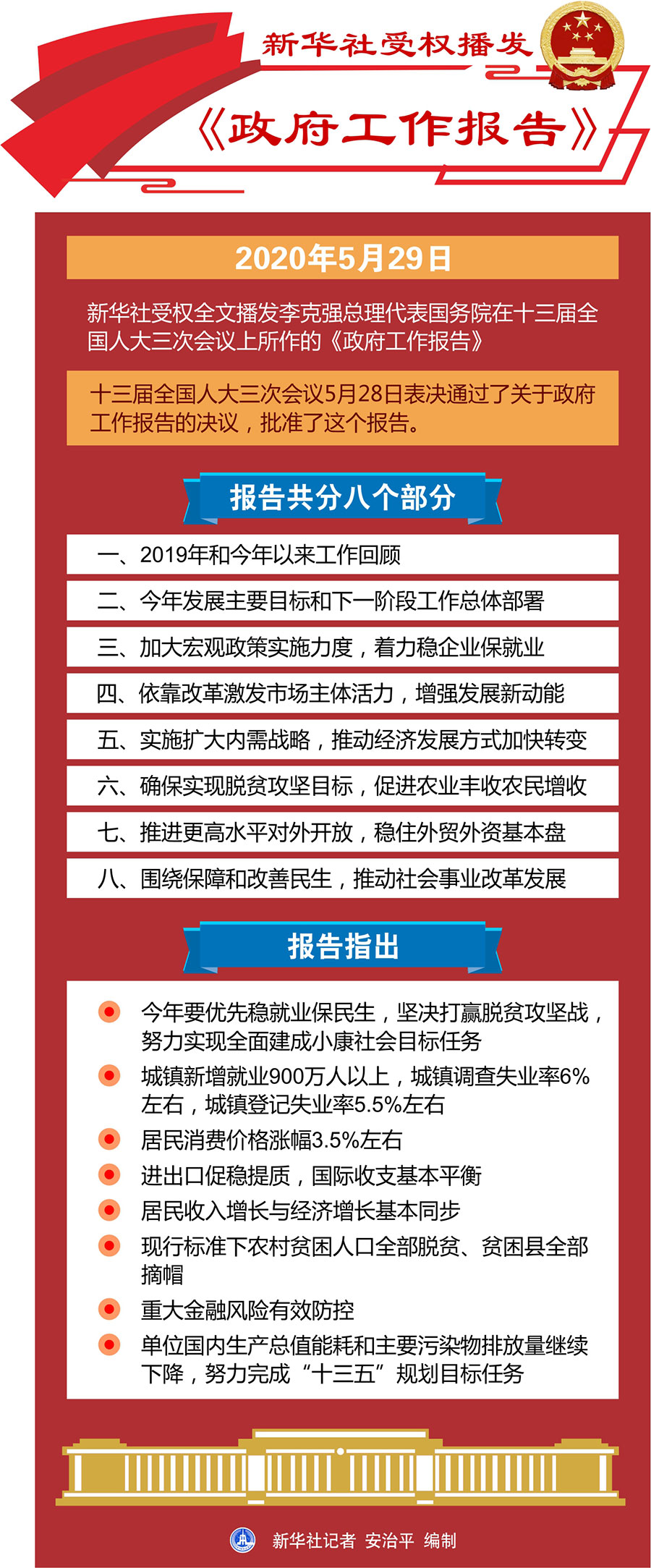 報(bào)告共分八個(gè)部分:一、2019年和今年以來工作回顧;二、今年發(fā)展主要目標(biāo)和下一階段工作總體部署;三、加大宏觀政策實(shí)施力度,著力穩(wěn)企業(yè)保就業(yè);四、依靠改革激發(fā)市場(chǎng)主體活力,增強(qiáng)發(fā)展新動(dòng)能;五、實(shí)施擴(kuò)大內(nèi)需戰(zhàn)略,推動(dòng)經(jīng)濟(jì)發(fā)展方式加快轉(zhuǎn)變;六、確保實(shí)現(xiàn)脫貧攻堅(jiān)目標(biāo),促進(jìn)農(nóng)業(yè)豐收農(nóng)民增收;七、推進(jìn)更高水平對(duì)外開放,穩(wěn)住外貿(mào)外資基本盤;八、圍繞保障和改善民生,推動(dòng)社會(huì)事業(yè)改革發(fā)展。