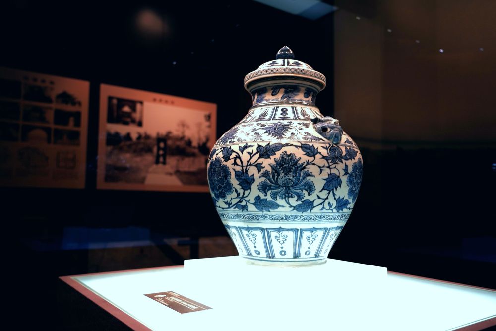 收藏在安徽省蚌埠市博物館的元青花纏枝牡丹紋獸耳蓋罐(6月9日攝)。新華社記者 朱青 攝