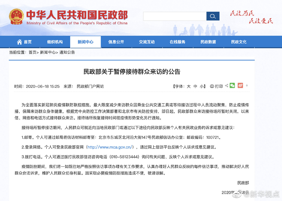 民政部18日發(fā)布消息,根據(jù)黨中央防控工作決策部署和北京市有關(guān)防控安排,即日起,民政部群眾來訪接待場所暫時關(guān)閉,以來信、網(wǎng)絡(luò)和電話方式接待群眾來訪。接待場所恢復(fù)接待時間視疫情形勢變化另行通知。(記者孫少龍) ????