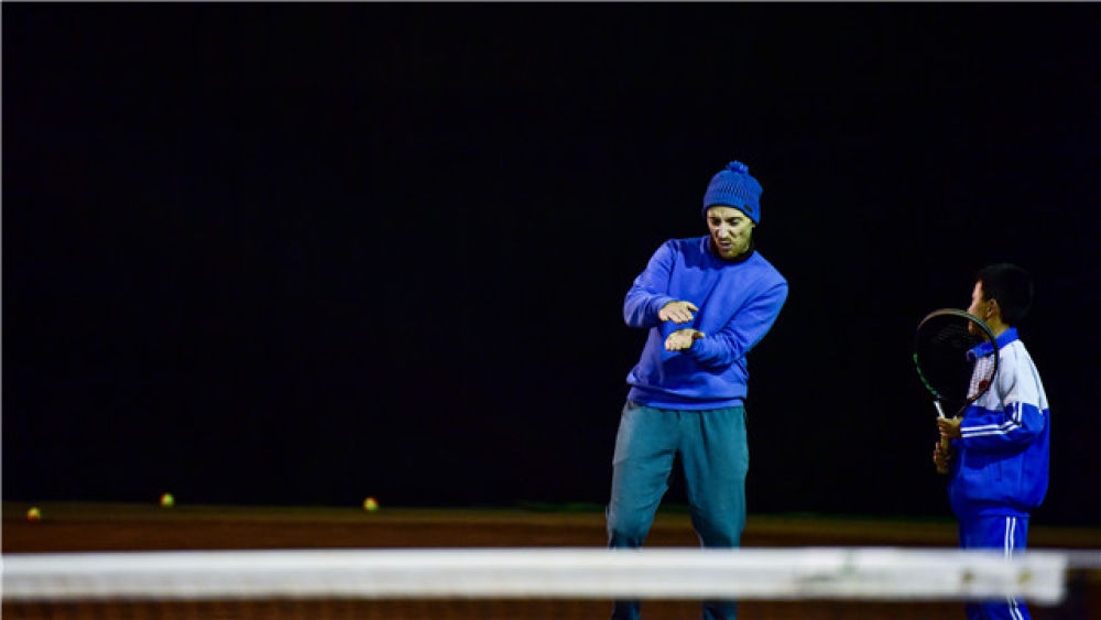 在青海省海東市互助土族自治縣的網(wǎng)球場(chǎng)內(nèi),喬西·羅賓遜(左)在指導(dǎo)學(xué)員發(fā)球(2019年11月7日攝)。新華社記者 吳剛 攝