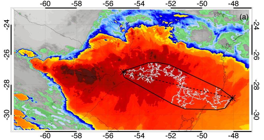 衛(wèi)星照片:?jiǎn)未伍L度最長閃電2018年10月31日發(fā)生在巴西南部。(圖片來源:世界氣象組織網(wǎng)站)