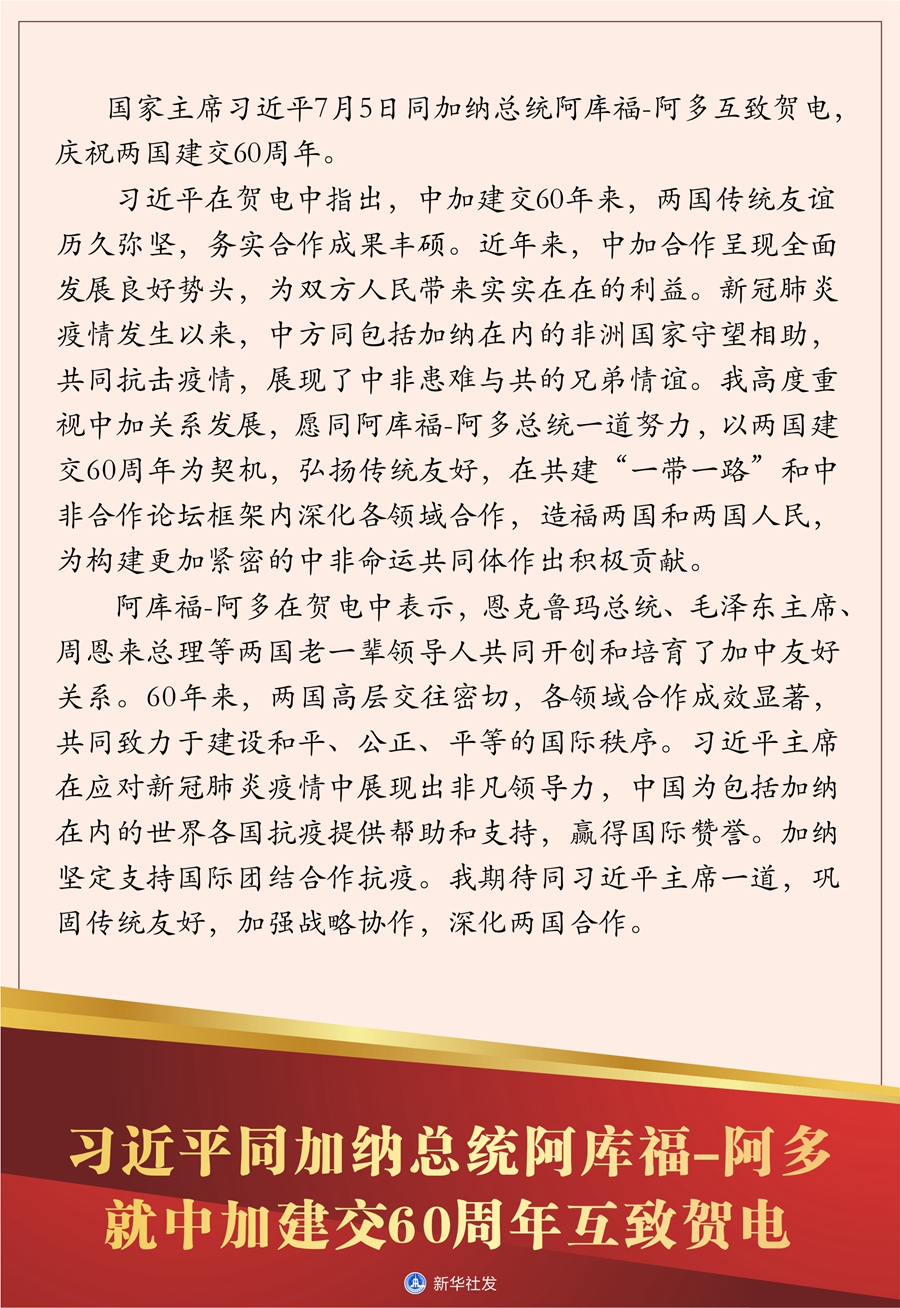 新華社北京7月5日電? 國家主席習近平7月5日同加納總統(tǒng)阿庫福-阿多互致賀電,慶祝兩國建交60周年。