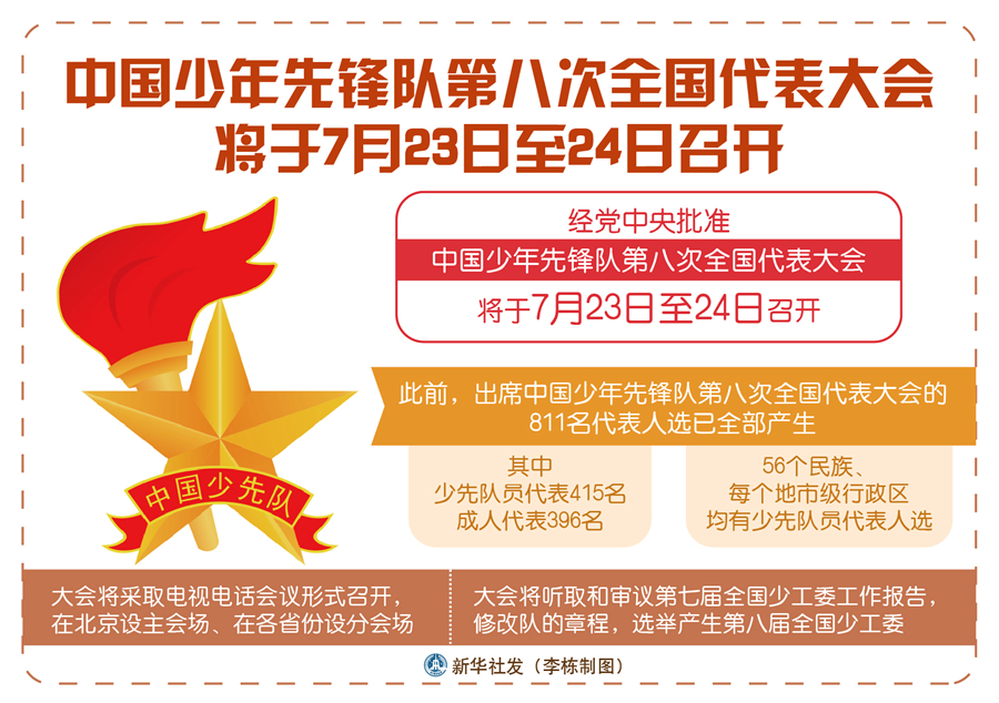 新華社北京7月20日電(記者王鵬)經(jīng)黨中央批準(zhǔn),中國(guó)少年先鋒隊(duì)第八次全國(guó)代表大會(huì)將于7月23日至24日召開(kāi)。目前,大會(huì)的各項(xiàng)籌備工作進(jìn)展順利。