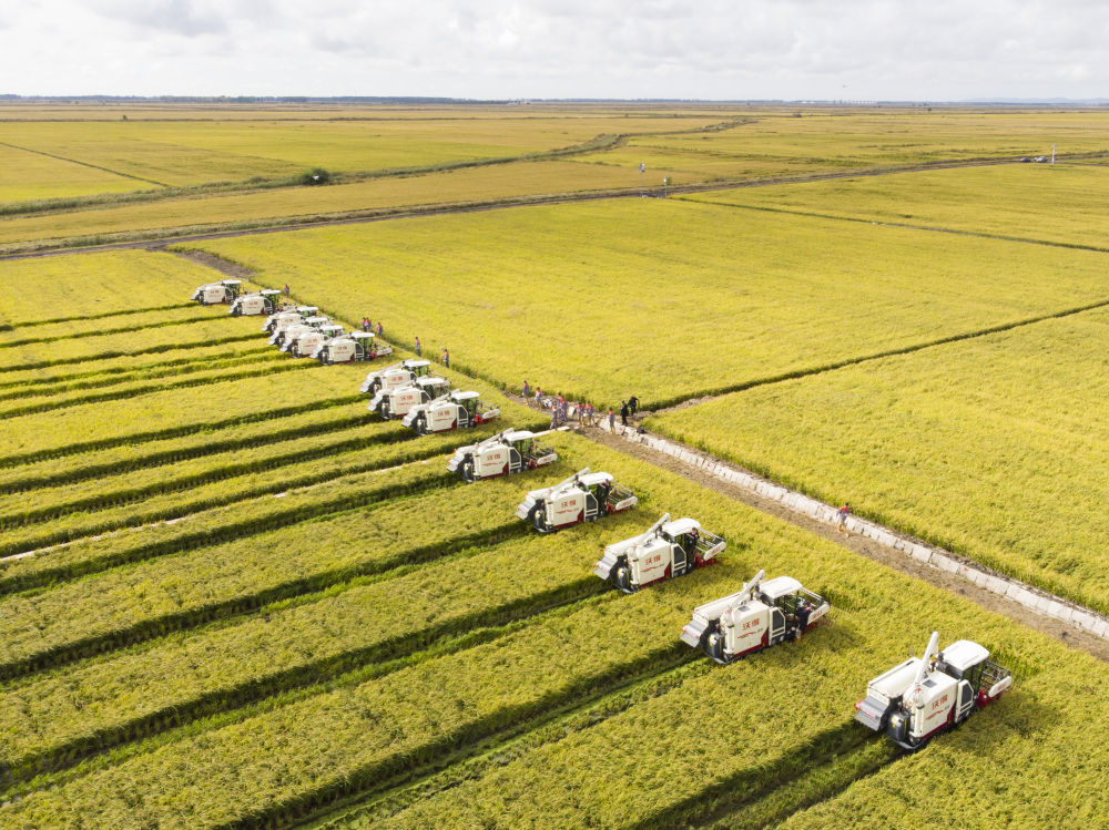 9月22日在黑龍江省富錦市萬畝水稻公園內(nèi)拍攝的開鐮儀式現(xiàn)場(chǎng)(無人機(jī)照片)。新華社發(fā)(張濤攝)