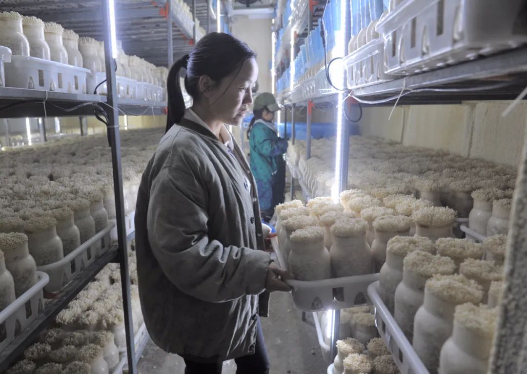 贛州市章貢區(qū)沙石鎮(zhèn)火燃村的貧困戶家庭成員,在扶貧車間低溫環(huán)境下從事蘑菇生產,實現(xiàn)就業(yè)脫貧 李傳材 攝