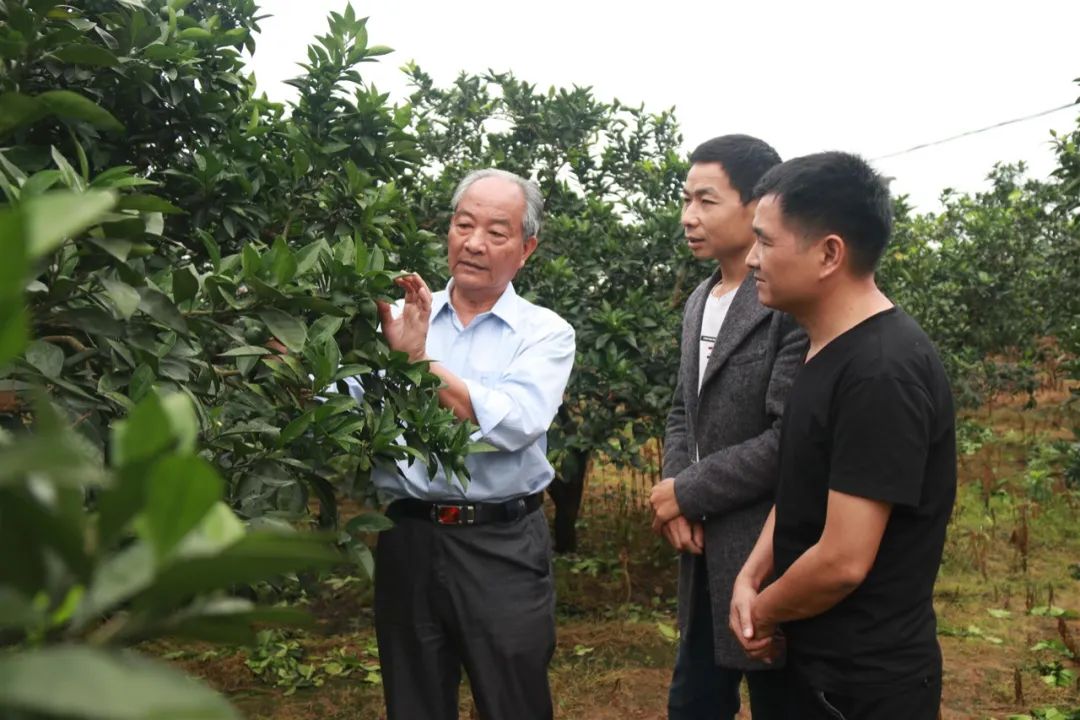 2020年5月23日,贛州市信豐縣大塘長崗村的客鄉(xiāng)橙園里,“贛南臍橙引種第一人”袁守根(左)在傳授臍橙種植技術 劉青 攝
