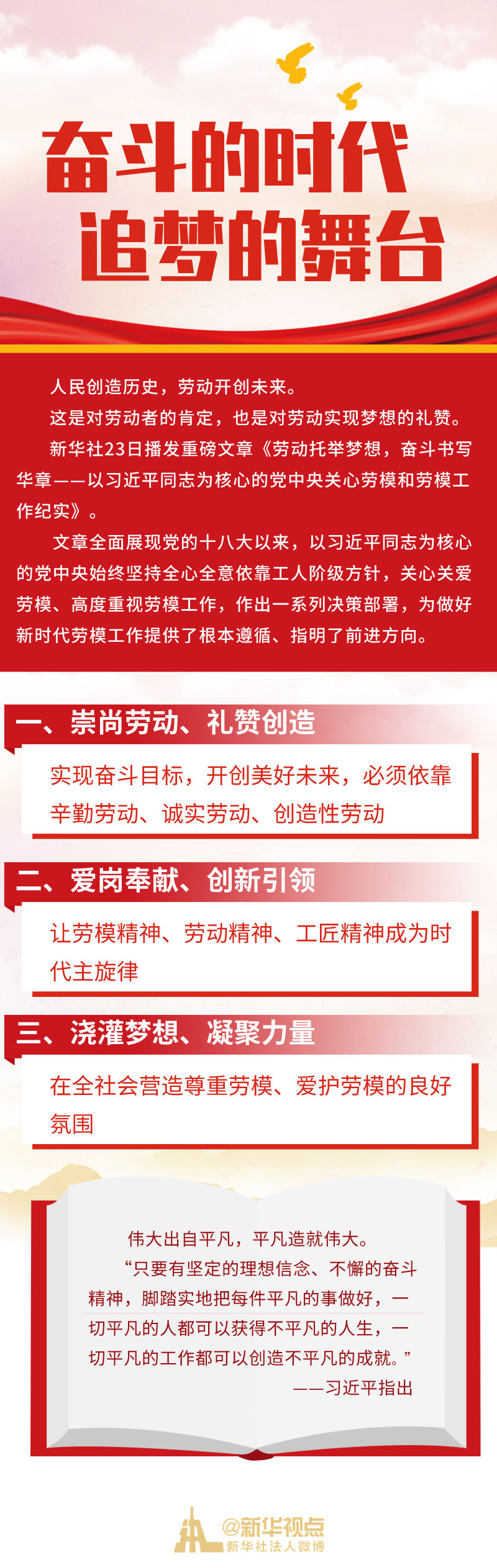 新華社23日播發(fā)重磅文章《勞動(dòng)托舉夢想,奮斗書寫華章——以習(xí)近平同志為核心的黨中央關(guān)心勞模和勞模工作紀(jì)實(shí)》。