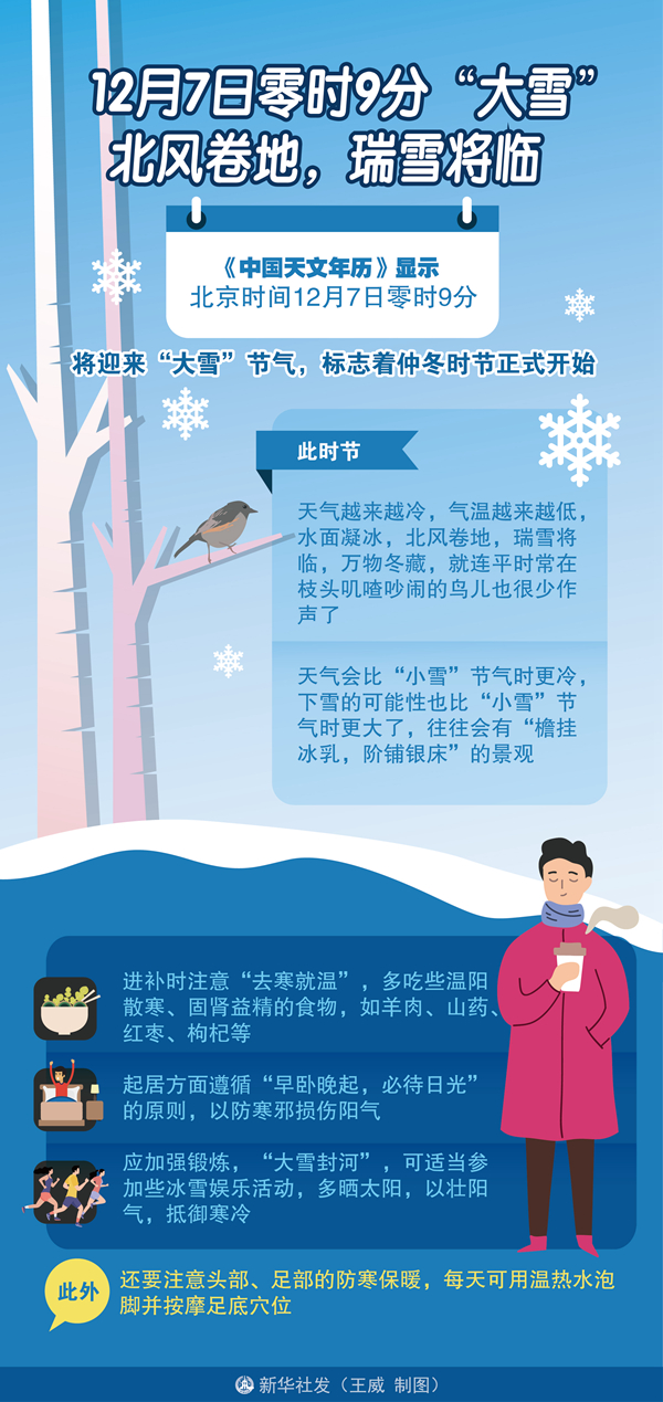 新華社天津12月5日電(記者周潤?。耙股钪┲?,時聞?wù)壑衤??!薄吨袊煳哪隁v》顯示,北京時間12月7日零時9分將迎來“大雪”節(jié)氣,標(biāo)志著仲冬時節(jié)正式開始。此時節(jié),天氣越來越冷,氣溫越來越低,水面凝冰,北風(fēng)卷地,瑞雪將臨,萬物冬藏,就連平時常在枝頭嘰喳吵鬧的鳥兒也很少作聲了。