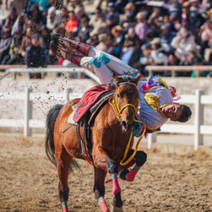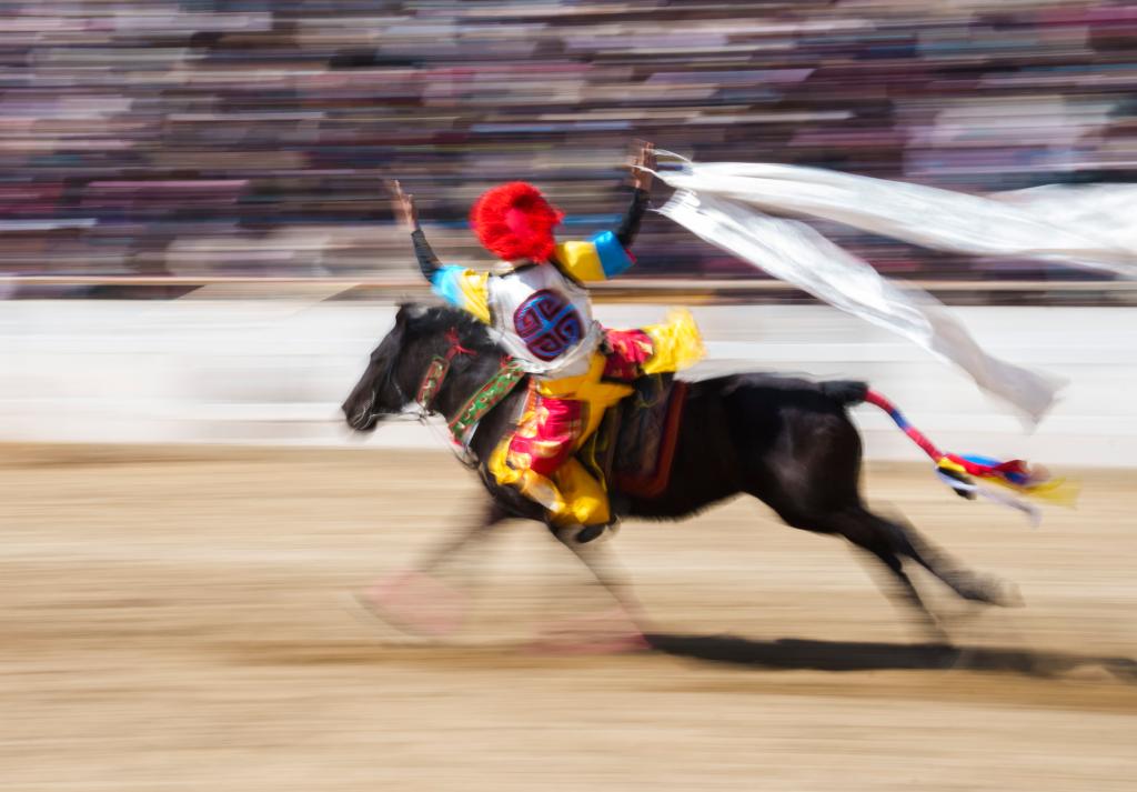 2月20日,马术队员在表演马上拾哈达。新华社记者 丁增尼达 摄