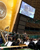 國(guó)東部時(shí)間5月20日下午,紐約曼哈頓,聯(lián)合國(guó)總部大會(huì)廳。一場(chǎng)中美軍樂(lè)團(tuán)聯(lián)合音樂(lè)會(huì)隆重舉行。首次走進(jìn)聯(lián)合國(guó)的中國(guó)人民解放軍軍樂(lè)團(tuán),演奏了《歌唱祖國(guó)》為音樂(lè)會(huì)“壓軸”。激昂的樂(lè)曲在這里回蕩,難忘的歷史在這里流淌……