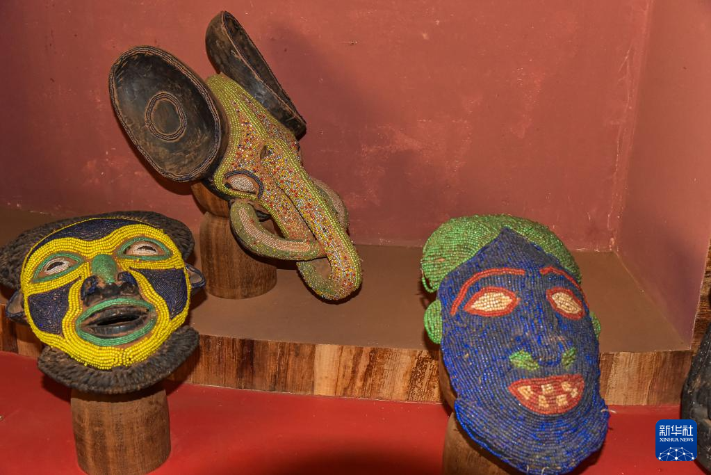 这是在喀麦隆姜村拍摄的喀麦隆文明博物馆展出的面具(4月10日摄)。