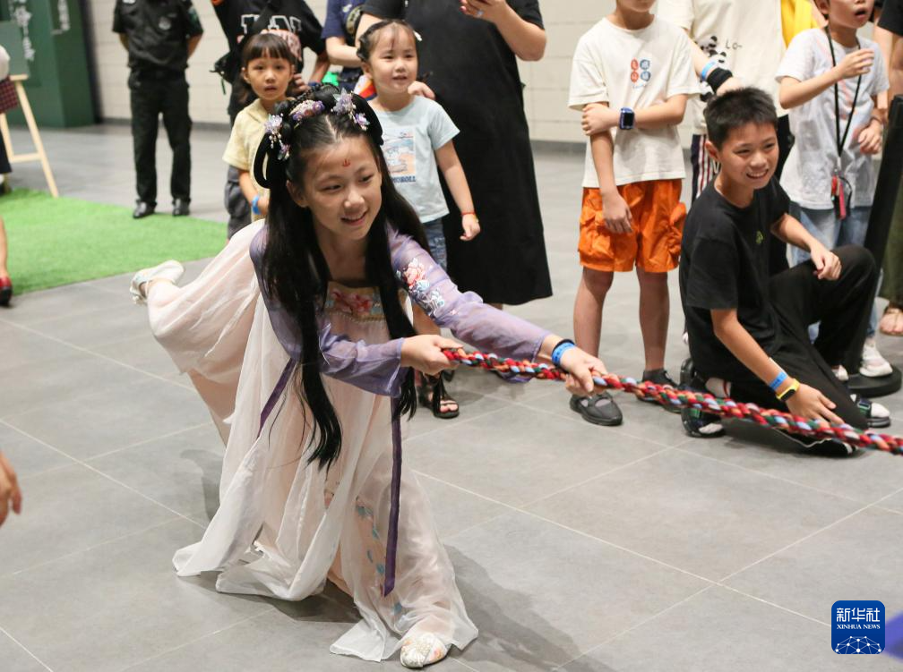 7月21日晚,小朋友在夜间“那达慕”大会上体验拔河。