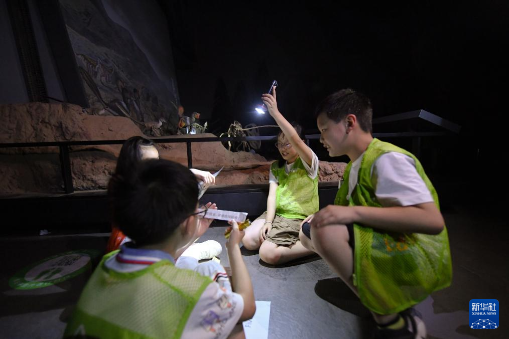 7月26日,参加夜游的孩子们在博物馆内了解恐龙。