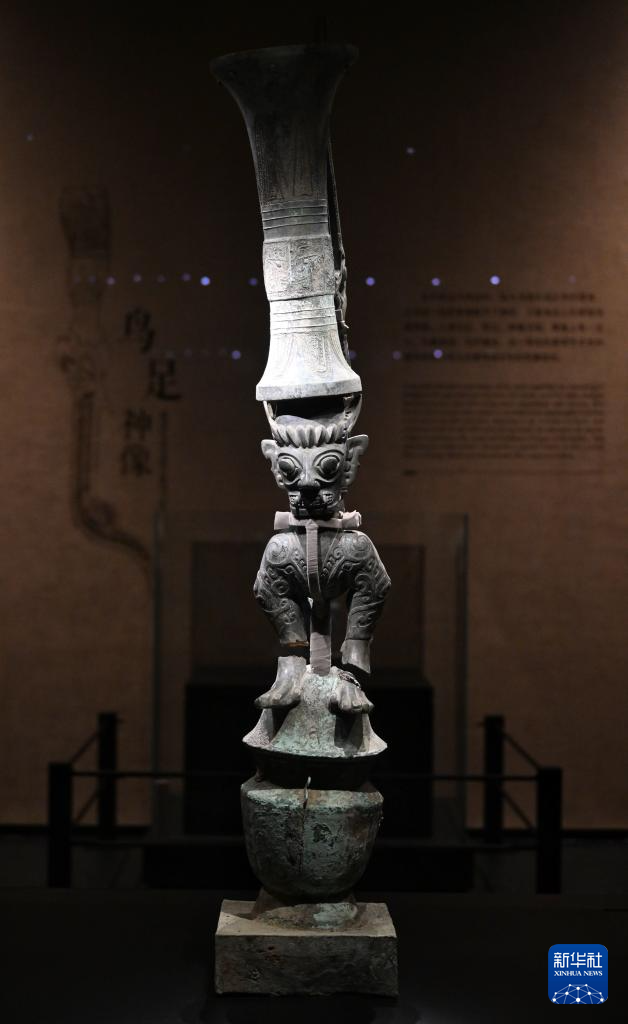 7月26日在三星堆博物馆新馆拍摄的青铜鸟足曲身顶尊神像。