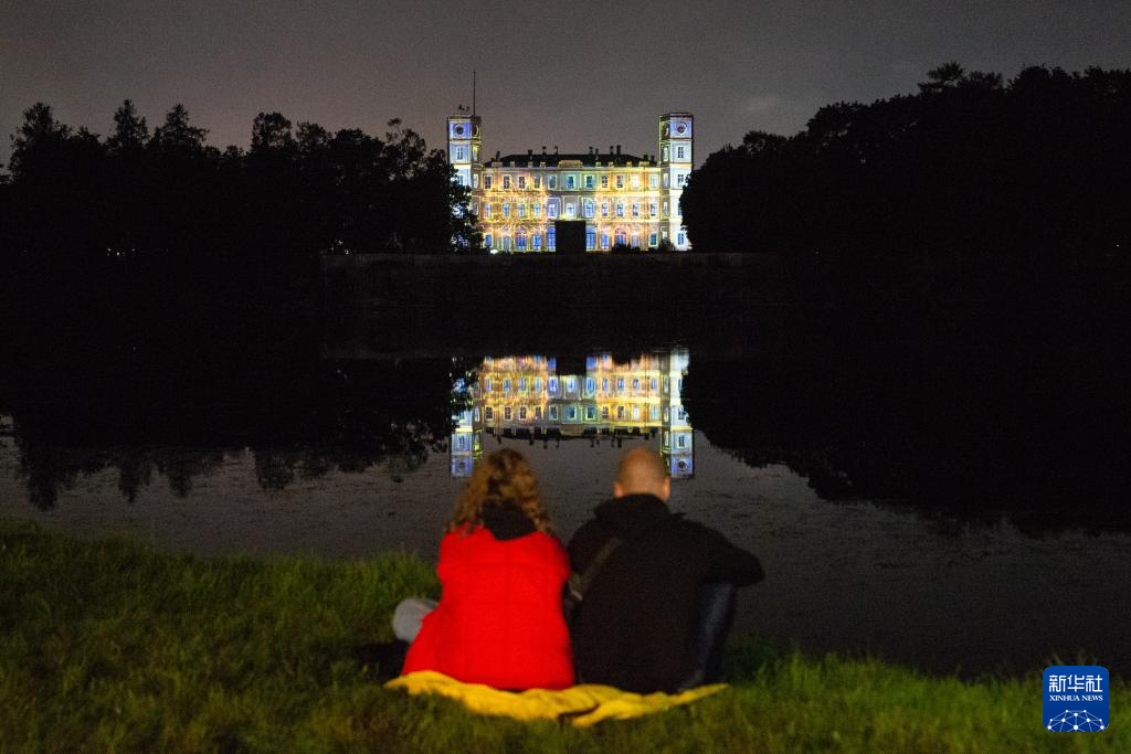 8月19日,民众在俄罗斯圣彼得堡附近的加特契纳宫观赏灯光秀。
