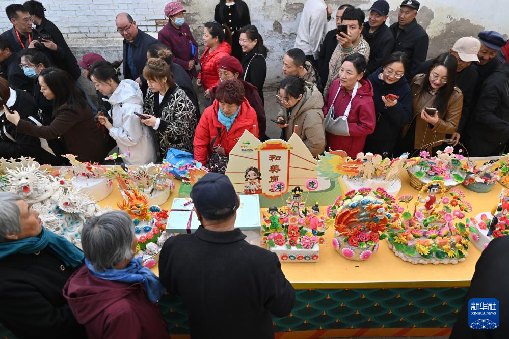 3月28日,在山西省岚县岚城镇,人们欣赏面塑作品。