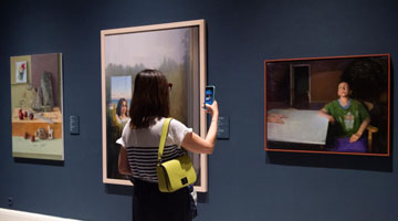4月16日,在西班牙首都马德里,参观者在“自然而然——中国当代艺术展”上拍照。