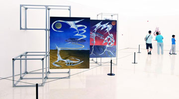 7月7日,在新疆克州阿图什市新时代文明实践中心,学生参观作品展览。