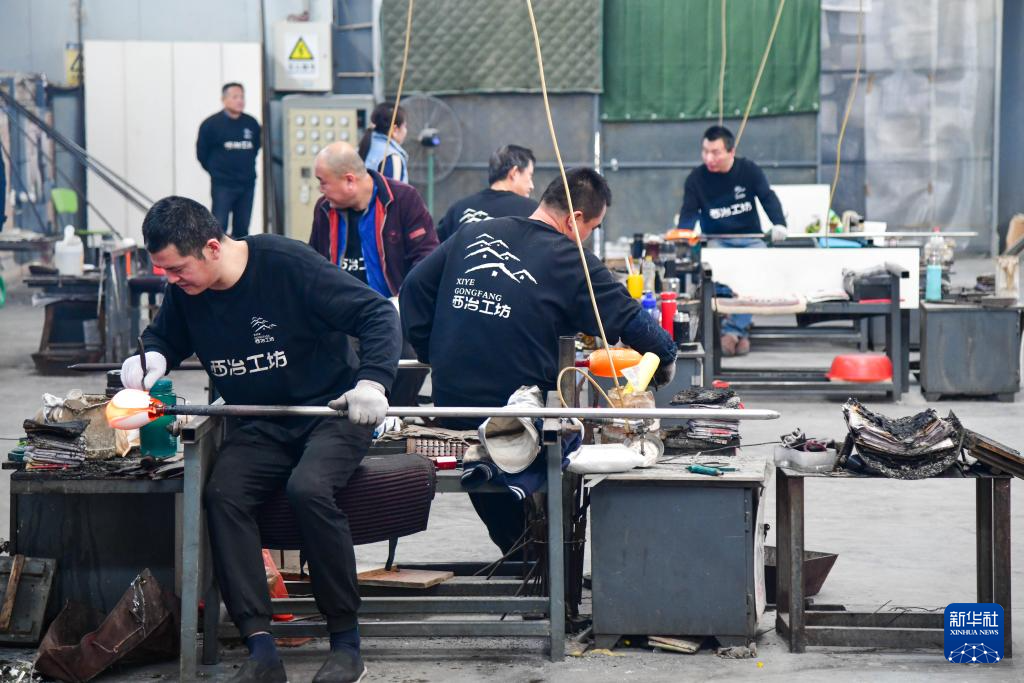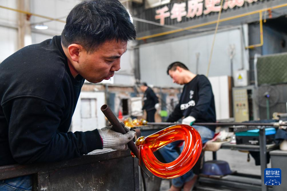 1月9日,在淄博市博山区的西冶工坊,工匠在加工琉璃工艺品。