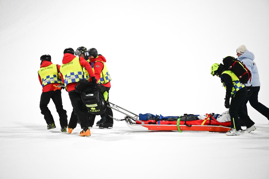 2月15日,芬兰选手拉尤宁(下)在第一轮试跳中受伤后被医护人员转移。他被迫退赛。
