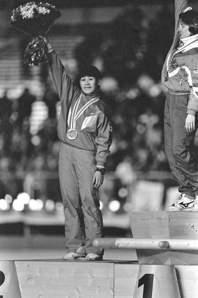 ↑1992年2月10日,中国选手叶乔波在颁奖仪式上。新华社记者 李根兴 摄
