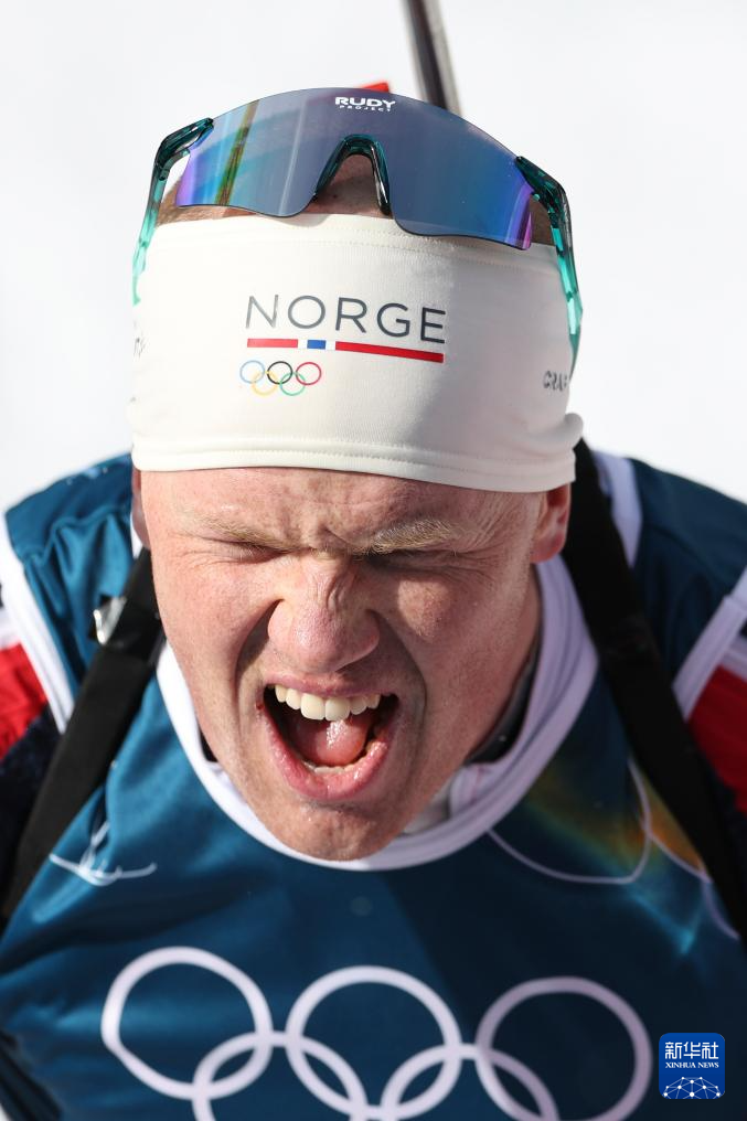 2月20日,挪威选手约翰内斯·戴尔冲线后庆祝。他获得冠军。