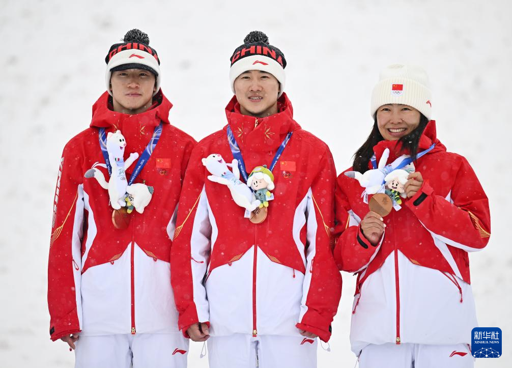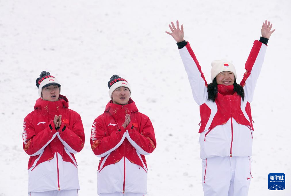 2月21日,中国队选手李天马(下)、徐梦桃(左)、王心迪在李天马第二轮比赛结束后。最终,中国队获得铜牌。