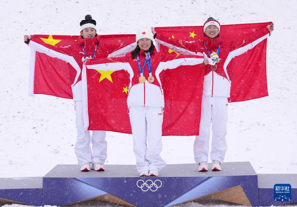2月21日,季军中国队选手李天马、王心迪、徐梦桃(从左至右)在颁奖仪式上。