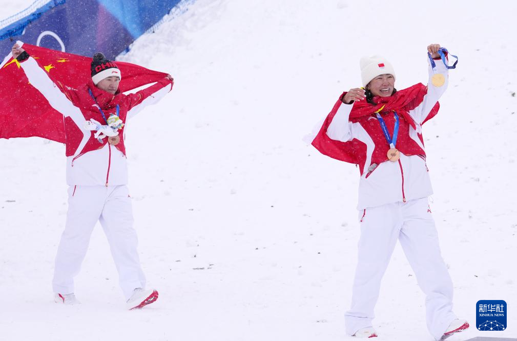 2月21日,中国队选手徐梦桃(左)在队友王心迪完成第二轮动作后。最终,中国队获得铜牌。