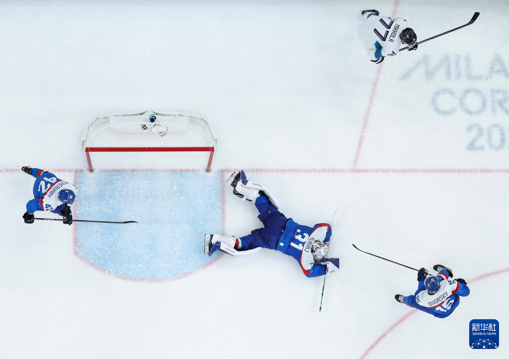 2月21日,斯洛伐克队守门员哈拉维(左二)在比赛中扑救。