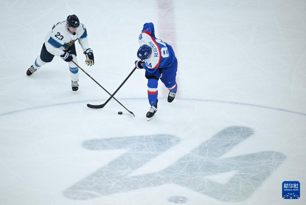2月21日,芬兰队球员格兰隆德(右)和斯洛伐克队球员斯拉夫科夫斯基在比赛中拼抢。