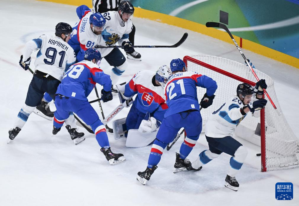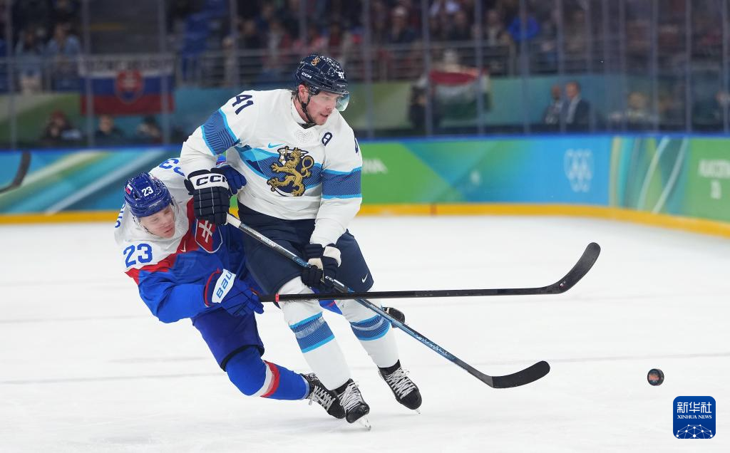 2月21日,芬兰队球员海斯卡宁(右)和斯洛伐克队球员利斯卡在比赛中拼抢。